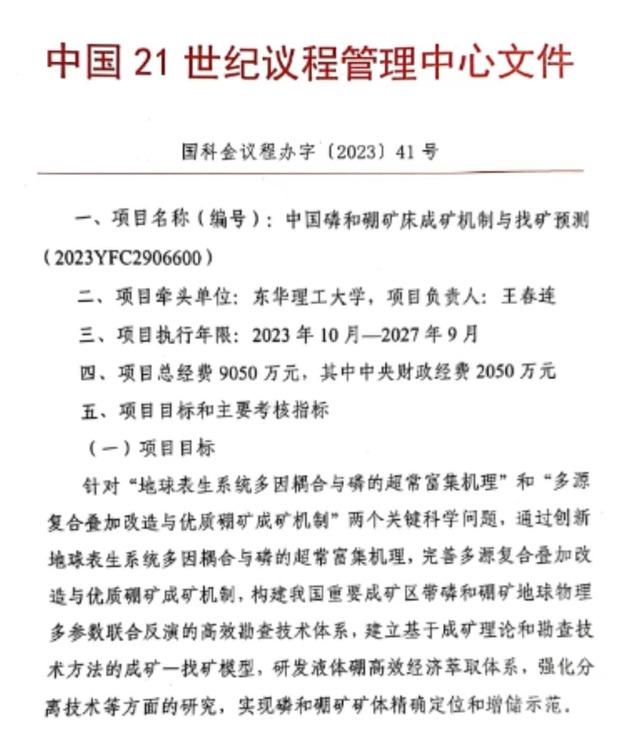 11月30日,科技部发布了《关于国家重点研发计划“战略性矿产资源开发利用”重点专项2023年度项目立项的通知》,我校为牵头单位、王春连教授为首席、联合10家单位申报的国家重点研发计划重点专项“中国磷和硼矿床成矿机制与找矿预测”(2023YFC2906600)项目获批准,项目总经费9050万元。