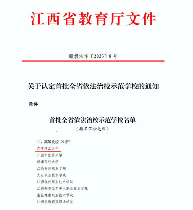 近日,省教育厅印发《关于认定首批全省依法治校示范学校的通知》(赣教法字〔2023〕8号),开云手机端·官方版在线入选“首批全省依法治校示范学校”,全省共9所高校入选。