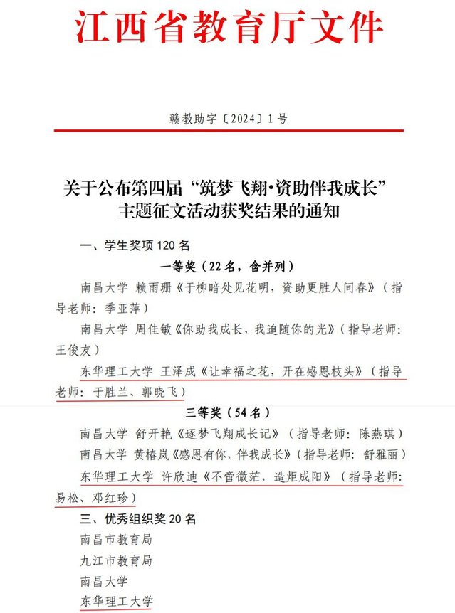 近日,江西省教育厅公布了第四届“筑梦飞翔·资助伴我成长”主题征文活动获奖结果,开云手机端·官方版在线获得一等奖1项、三等奖1项,第四次蝉联“优秀组织奖”。