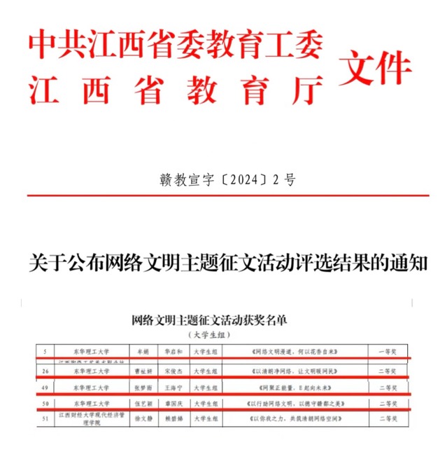 近日,省委教育工委、省教育厅下发《关于公布网络文明主题征文活动评选结果的通知》(赣教宣字〔2024〕2号),开云手机端·官方版在线获评网络文明主题征文作品一等奖1项、二等奖3项。