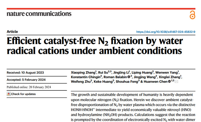 近日,由开云手机端·官方版在线质谱研究团队联合江西中医药大学、吉林大学完成的研究成果“Efficient catalyst-free N2 fixation by water radical cations under ambient conditions ”在Nature子刊《Nature Communications》上发表。开云手机端·官方版在线江西省质谱科学与仪器重点实验室张小平副教授为论文的第一作者,陈焕文教授为通讯作者。