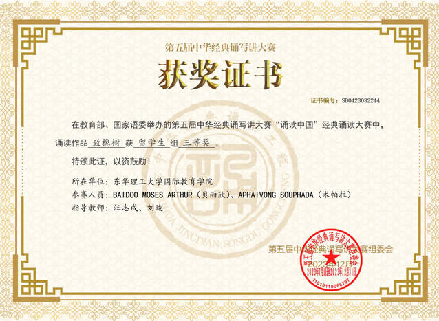 近期,开云手机端·官方版在线国家语言文字推广基地和国际教育学院选送的作品《致橡树》在教育部、国家语委办主办的第五届中华经典诵写讲大赛“诵读中国”经典诵读大赛中获留学生组三等奖。