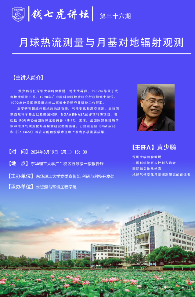 应水资源与环境工程学院邀请,深圳大学特聘教授,国际知名地热学家,地球气候变化月基探测研究的首倡者黄少鹏来到“开云(中国)”,以“月球热流测量与月基对地辐射观测”为主题开展讲座。欢迎全校师生届时前往聆听。