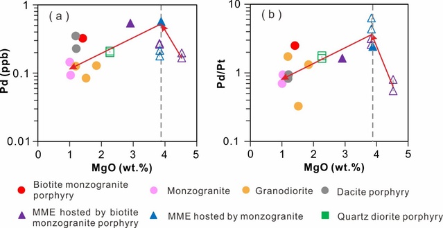 图1. (a)冲江岩浆岩序列Pd vs. MgO含量变化及(b) Pd/Pt vs. MgO含量变化,指示在岩浆演化至3.9 wt.% MgO时发生了硫化物饱和