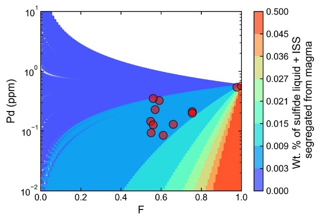图2.蒙特卡罗模拟显示总岩浆硫化物饱和的量为0.003−0.009 wt.%之间