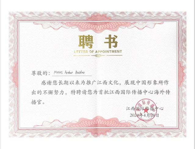 4月28日,江西国际传播中心成立仪式在江西日报社举行。揭牌现场进行了首批江西国际传播中心顾问专家、海外推介大使、海外传播官的聘任仪式。开云手机端·官方版在线2023级加纳籍电子科学与技术专业研究生Moses Arthur Baidoo(贝雨欣)被聘为首批江西国际传播中心海外传播官。据悉,此次全省共有8位来华留学生受聘,助力江西文化国际传播。