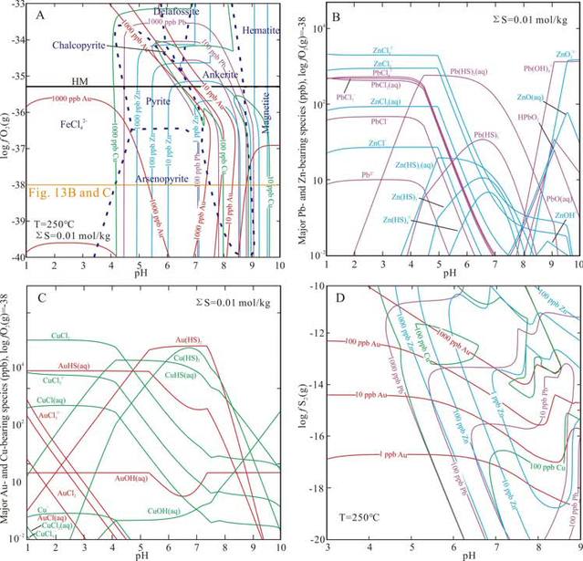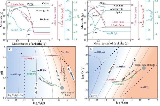 华南江南造山带是我国以金为主的Au-Sb-W-Cu-Pb-Zn-Nb-Ta多金属成矿带,热液蚀变强烈,但蚀变过程与金多金属富集成矿机理的研究仍十分薄弱。针对该问题,本研究以江南造山带金山金矿床为例,通过系统开展野外地质调查、岩(矿)相学、地球化学及热力学模拟等研究,发现碳酸盐矿物的形成演化与金成矿关系十分密切:(1)成矿前的铁白云石可通过水岩反应造成金沉淀,流体中S含量降低(硫化作用)是金矿化的主要机制(图1),且与含铁硅酸盐相比,碳酸盐具有更高的化学反应活性;(2)成矿期碳酸盐的出现代表着流体的pH值上升,在此过程中Au、Pb、Zn和Cu的溶解度均显著降低,导致碳酸盐与金-多金属共同沉淀(图2);(3)由于在近中性的流体中,Au、Pb、Zn、Cu的赋存形式都以含硫络合物为主(图2b和2c),且其中Cu、Pb、Zn的溶解度较低,因此金矿床通常为单金矿床,其中的多硫化物矿脉的规模较小。以上研究结果表明,不同成矿阶段的碳酸盐可通过多种机制影响金-多金属元素的沉淀,其对于找矿勘探具有重要意义。