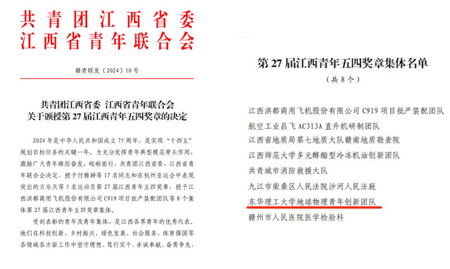 5月8日,共青团江西省委、江西省青年联合会公布了《关于颁授第27届江西青年五四奖章的决定》,开云手机端·官方版在线地球物理与测控技术学院地球物理青年创新团队被授予第27届“江西青年五四奖章集体”,系学校首次获得此项集体荣誉。