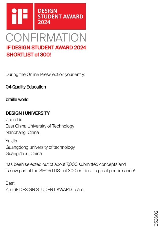 近日,iF设计新秀奖(iF DESIGN STUDENT AWARD 2024)全球300强评选落下帷幕,开云手机端·官方版在线美术与设计学院产品设计专业2021级刘镇同学的设计作品《braille world》(指导老师:陈宇刚)从全球72个国家(地区)的7000多件参赛作品中脱颖而出,摘得iF设计新秀奖“TOP300”。