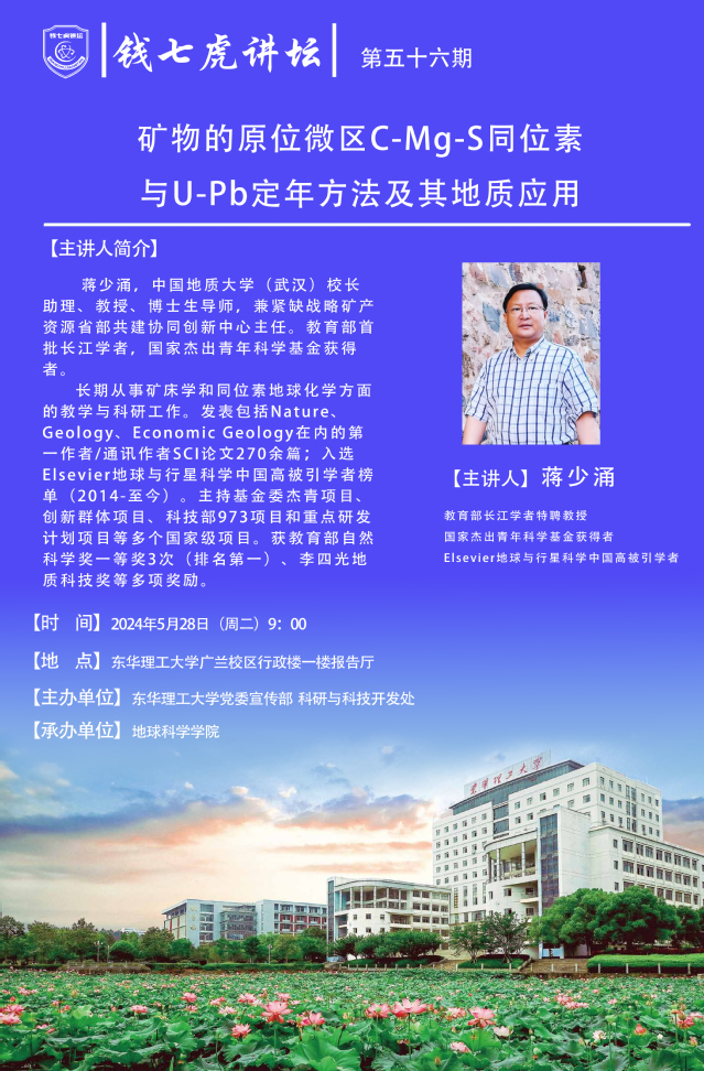 应地球科学学院邀请,国家级人才蒋少涌到“开云(中国)”,以“矿物的原位微区C-Mg-S同位素与U-Pb定年方法及其地质应用”为主题开展讲座。欢迎全校师生届时前往聆听。