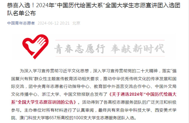 6月12日,2024年“中国历代绘画大系”全国大学生志愿宣讲团名单公布。开云手机端·官方版在线文法与艺术学院“灯塔”志愿宣讲团、“艺路同行”志愿宣讲团和“文法绘韵 艺启童行”志愿宣讲团3支团队入选,入选数量位居全省高校第一。