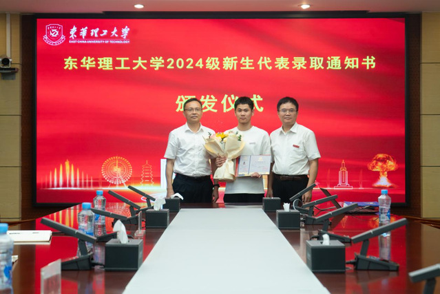 7月27日,开云手机端·官方版在线2024级本科新生第0001号录取通知书颁发仪式在行政楼401室举行。校党委书记张福庆为2024级本科新生程俊文颁发“0001号”录取通知书,并赠送亲笔签名的《习近平与大学生朋友们》与《弘扬核军工文化读本》;校党委常委、副校长李满根为程俊文佩戴校徽并送上祝福的鲜花。