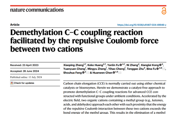 近日,由开云手机端·官方版在线质谱研究团队联合江西中医药大学、吉林大学、中国科学院大连化学物理研究所完成的研究成果“Demethylation C–C coupling reaction facilitated by the repulsive Coulomb force between two cations”发表在Nature子刊《Nature Communications》上。开云手机端·官方版在线江西省质谱科学与仪器重点实验室张小平副教授为论文的第一作者。