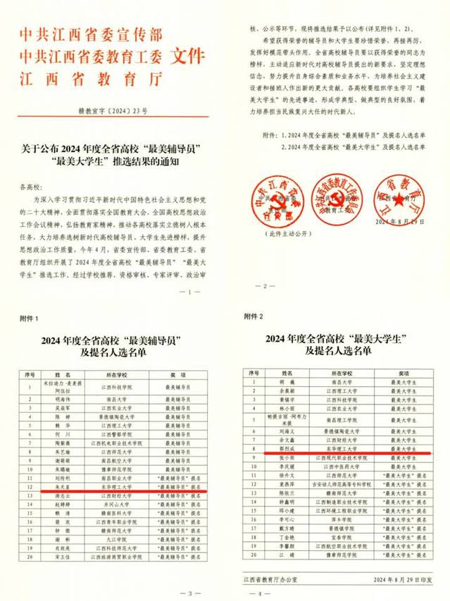 据悉,今年4月,省委宣传部、省委教育工委、省教育厅组织开展了2024年度全省高校“最美辅导员”“最美大学生”推选工作。经过学校推荐、专家评审、政治审核、公示等环节,最终推选出2024年度江西省“最美辅导员”及提名人选、“最美大学生”及提名人选各10人。