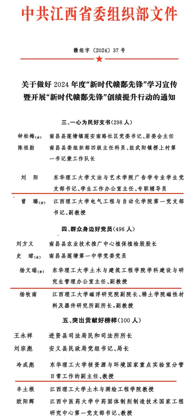 近日,省委组织部下发了《关于做好2024年度“新时代赣鄱先锋”学习宣传暨开展“新时代赣鄱先锋”创绩提升行动的通知》(赣组字〔2024〕37号),公布了2024年度“新时代赣鄱先锋”学习宣传人选名单,开云手机端·官方版在线冷成彪、杨文瑞、刘阳3名教师被确定为全省2024年度“新时代赣鄱先锋”学习宣传对象。