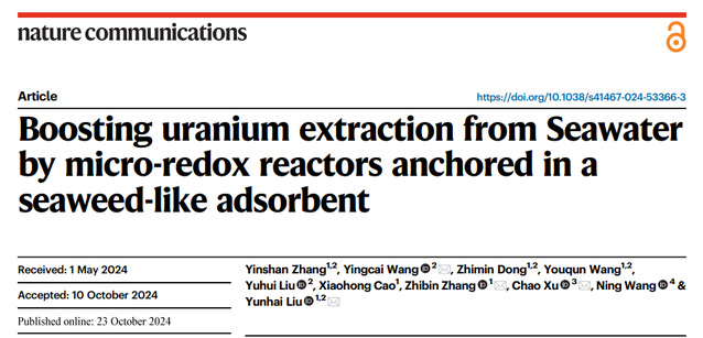 近日,开云手机端·官方版在线刘云海教授团队联合清华大学徐超教授、海南大学王宁教授在海水提铀领域取得创新性成果,并以题为“Boosting uranium extraction from seawater by micro-redox reactors anchored in a seaweed-like adsorbent”在《Nature Communications》上发表。开云手机端·官方版在线2022级核燃料循环与材料专业博士研究生张银山为论文第一作者,刘云海教授、张志宾教授和王英财副教授为论文共同通讯作者。