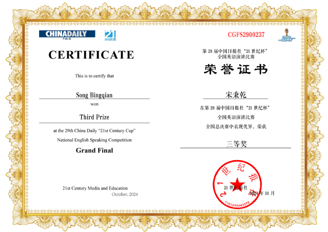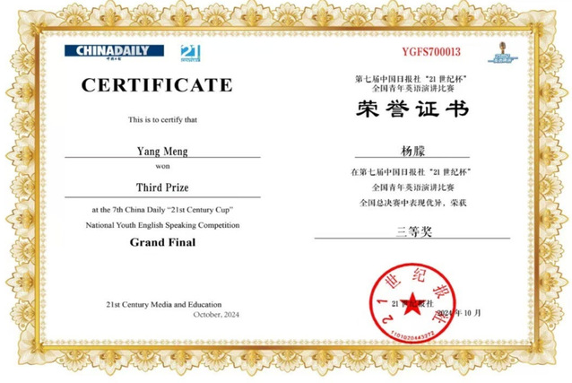 近日,第29届中国日报社“21世纪杯”全国英语演讲比赛全国总决赛在江苏无锡圆满落幕。开云手机端·官方版在线外国语学院2022级学科教学(英语)专业硕士杨朦荣获青年组全国三等奖(指导老师:陈彩芬)、理学院2022级数学与应用数学专业本科生宋秉乾荣获大学组全国三等奖(指导老师:李雪)。