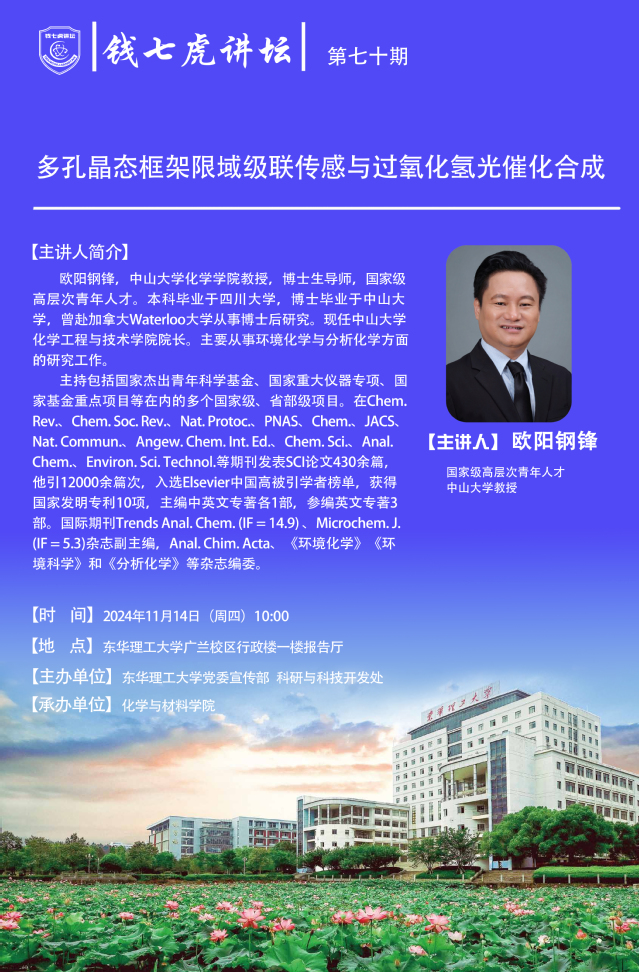应化学与材料学院邀请,国家级高层次青年人才欧阳钢锋到“开云(中国)”,以“多孔晶态框架限域级联传感与过氧化氢光催化合成”为主题开展讲座。欢迎全校师生届时前往聆听。