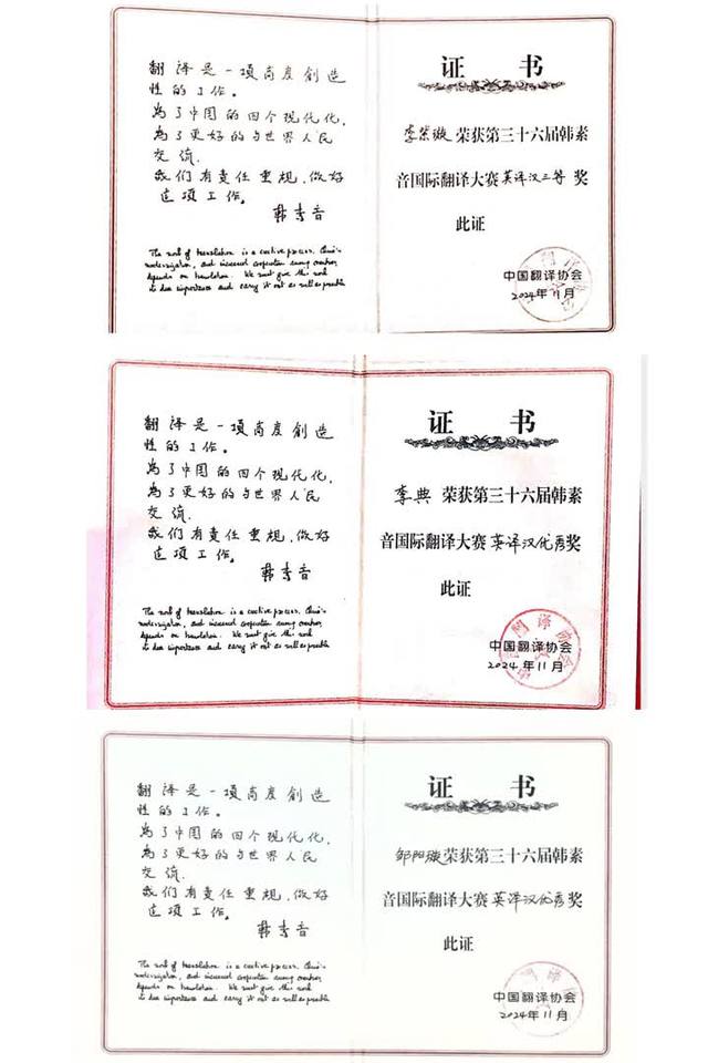 据悉,韩素音国际翻译大赛创办于1989年,是中国翻译界组织时间最长、规模最大、影响最广的翻译大赛之一。2024年第三十六届韩素音国际翻译大赛由中国翻译协会、中国翻译研究院、当代中国与世界研究院与湖南师范大学联合主办,教育部中外语言交流合作中心支持,《中国翻译》杂志社、湖南师范大学外国语学院共同承办。本届大赛设立汉语与英语、法语、俄语、西班牙语、阿拉伯语、德语、日语、朝鲜语、葡萄牙语、意大利语10个语种的双向互译,共计20个比赛项目。大赛共收到参赛译文30864份,经过严格的评审和终审讨论,共评出获奖者1230名。其中一等奖21名;二等奖55名;三等奖88名;优秀奖1066名。(文/图 吴冰)