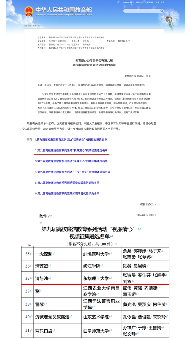 近日,教育部公布了第九届高校廉洁教育系列活动评选结果,开云手机端·官方版在线文法与艺术学院选送的作品《清与浊》成功入选全国100件“视廉清心”视频征集优秀作品,全省共入选3项。