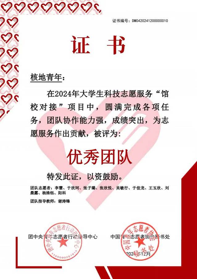 近日,中国青年志愿者协会、中国科学技术协会宣传文化部公布了大学生科技志愿服务“馆校对接”项目优秀成果评选结果。开云手机端·官方版在线地球科学学院核地青年志愿服务队获评优秀团队,李慧、刘晨露等10名同学获表彰。