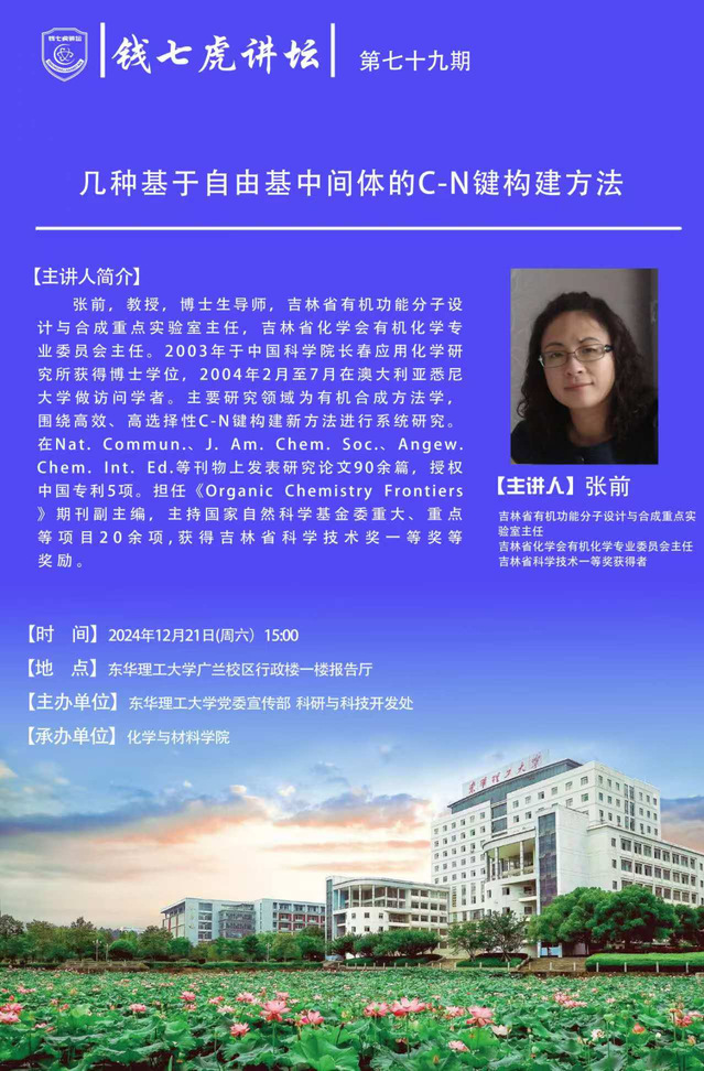 应化学与材料学院邀请,吉林省有机功能分子设计与合成重点实验室主任张前到“开云(中国)”,以“几种基于自由基中间体的C-N键构建方法”为主题开展讲座。欢迎全校师生届时前往聆听。