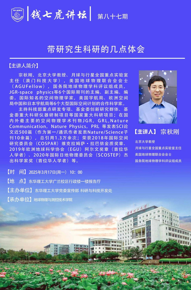 宗秋刚,北京大学教授、月球与行星全国重点实验室主任(澳门科技大学),美国地球物理联合会会士(AGUFellow),国务院地球物理学科评议组成员,JGR-space physics等6个国际期刊的主编、副主编、编委。在国内外最主要的空间物理学术刊物JGR,GRL,NatureCommunication,Nature Physics,PRL等发表SCI论文近500篇(作为第一/通讯作者发表Nature/Science子刊10余篇),总引用1.3万余次;国际知名的空间物理学家,美国宇航局、欧洲空间局中国和日本宇航局等6个大型国际空间计划的合作科学家。主持科技部重点研发专项、基金委创新研究群体、基金委重大科研仪器研制项目等国家重大科研项目;荣获2018年国际空间研究委员会(COSPAR)维克拉姆萨·拉巴依金质奖章、2019年欧洲地球科学协会(EGU)阿尔文奖章(首位华人学者)、2020年国际日地物理委员会(SCOSTEP)杰出科学家奖(首位华人学者)等。
