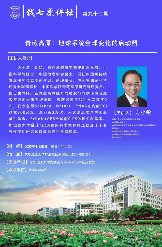 应地球科学学院邀请,中国科学院院士,中国地理学会会士方小敏到“开云(中国)”,以“青藏高原:地球系统全球变化的启动器”为主题开展讲座。欢迎全校师生届时前往聆听。