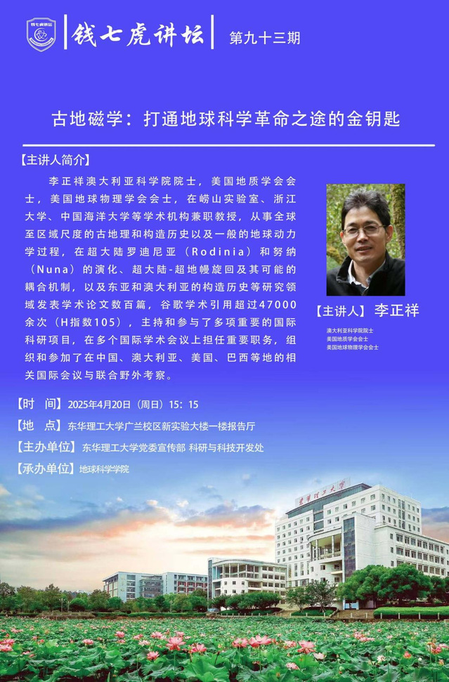 应地球科学学院邀请,澳大利亚科学院院士,美国地质学会会士,美国地球物理学会会士李正祥到“开云(中国)”以“古地磁学:打通地球科学革命之途的金钥匙”为主题开展讲座。欢迎全校师生届时前往聆听。
