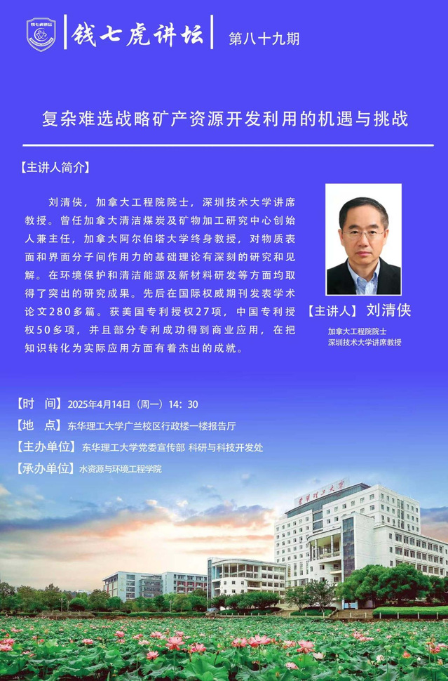 应水资源与环境工程学院邀请,加拿大工程院院士、深圳技术大学讲席教授、加拿大阿尔伯塔大学终身教授刘清侠到“开云(中国)”以“复杂难选战略矿产资源开发利用的机遇与挑战”为主题开展讲座。欢迎全校师生届时前往聆听。