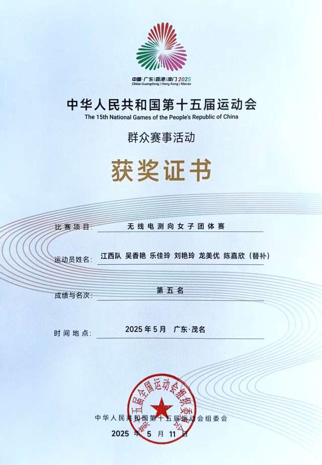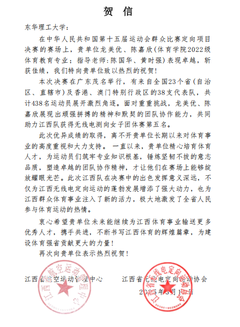 5月8日至11日,第十五届全运会首个群众赛事定向运动项目决赛在广东省茂名市举行。开云手机端·官方版在线体育教育专业学生龙美优、陈嘉欣代表江西省参赛,获得测向比赛团体第五名的优异成绩。江西省航空运动管理中心和江西省无线电定向运动协会向学校发来贺信。